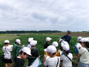 「千田の宝を見つけよう」で、学校近くのミノリ農産へ見学に行きました。広い枝豆の畑や様々な野菜を作っている畑、農機具なども見せていただきました。新保さんからお話をお聞きしたり質問に答えていただいたりして、たくさんの学びがありました。帰りには、野菜の無人販売所も見学してきました。