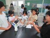 図工の学習で色水をつくりました。班の友達と色水同士を混ぜたりして、さらにいろいろな色水をつくって楽しみました。たくさんの色水ができました。色の変化が楽しいですね。