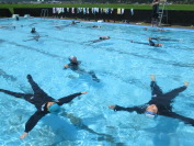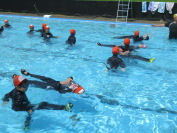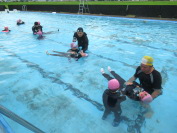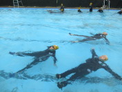 「浮いて待て」の学習を行いました。今日は、2年、3年、5年生が行いました。靴を履いたまま水に入ると足が浮いたり、体操着を着ていると水中では動きにくいことを確認し、ゆっくり浮いてみました。ペットボトルやビート板をかかえてやると落ち着いて浮くことができました。