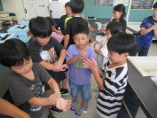 手洗い実験3日目、最終日です。1年生がたくさん来てくれました。保健委員会の5・6年生の説明をよく聞いてジェルをつけたり手を洗ったりしました。洗い残しがなくなるまで、きれいに手を洗って、合格するとシールをもらいました。