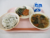 2回目のおぢやっ子わくわくメニューです。今月のテーマは、「大阪・関西万博ねニュー」です。万博の開催地である、大阪の料理を給食に取り入れました。メニューは、わかめごはん、厚揚げのお好みソース焼き、のり酢和え、船場汁、牛乳です。大阪の味を美味しくいただきました。