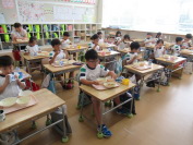 七夕にちなんで、今日の給食は七夕献立です。七夕ちらし寿司、きらきら星のサラダ、天の川スープ、七夕デザート(ゼリー)、牛乳でした。星がたくさんちりばめられた献立に子どもたちは大喜びでした。みんなで味わって美味しくいただきました。