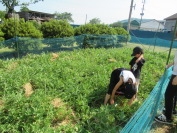 スイカにかわいらしい実ができ、どんどん大きくなってきました。スイカの先生の和田さんからおいでいただき、カラスからスイカを守る仕掛けを一緒に作りました。また、雄花と雌花を教えてもらい、人工授粉にも挑戦しました。