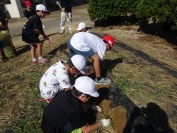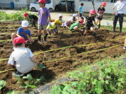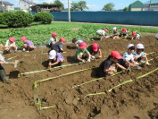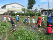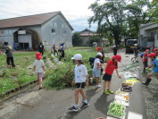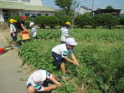 1年生が畑で育てているさつまいもの周りに草がたくさん生い茂っています。さつまいもが大きくなるように、さつまいもの周りの草をみんなで取りました。さつまいもの苗を踏まないようにしながら、みんなで協力して取っていました。大きなゴミ袋に3つ分も草がたまりました。