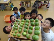 夏休み前半にたくさん収穫して美味しく食べたスイカの畑を片付けました。スイカのつるを抜いてマルチシートをはがして、きれいに片付けをしました。つるを抜く前に取った小さなかわいらしいスイカがたくさん。食べられませんが、もったいなくて、3年生はスイカを教室に持って行き、並べていました。