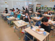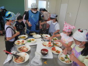 2年生は、畑で育てた夏野菜を使って夏野菜ピザを作りました。餃子の皮にケチャップやマヨネーズを塗り、その上に刻んだオクラやカボチャ、ナス、ピーマンなどの夏野菜をのせ、最後にチーズものせて焼きました。美味しい夏野菜ピザがたくさんできました。