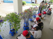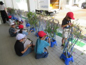 夏休みも大切にお世話をしたアサガオは、今も花を咲かせています。種もできて、種取りをしたり、アサガオの現在の様子を観察したりして、カードに書きました。種がたまってきて、喜んでいる1年生です。